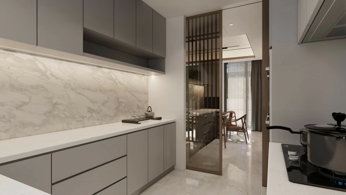 藉由與沙發同高的矮牆上方增加玻璃既能夠區隔機能,也能夠有牆體帶來的踏實感。因矮牆與玻璃的材質相互搭配,豐富整體視覺層次,光線也能透過玻璃的折射將更多的光線引入室內,顯現多樣化的美感體驗也使空間更為寬敞。